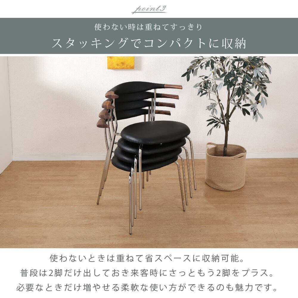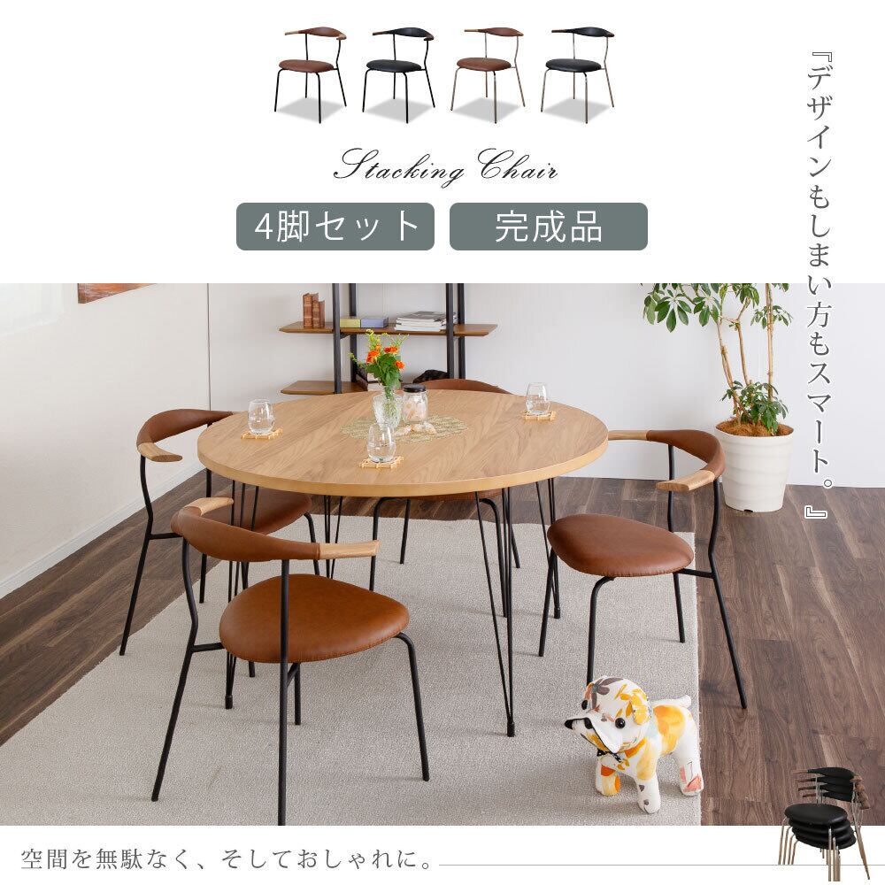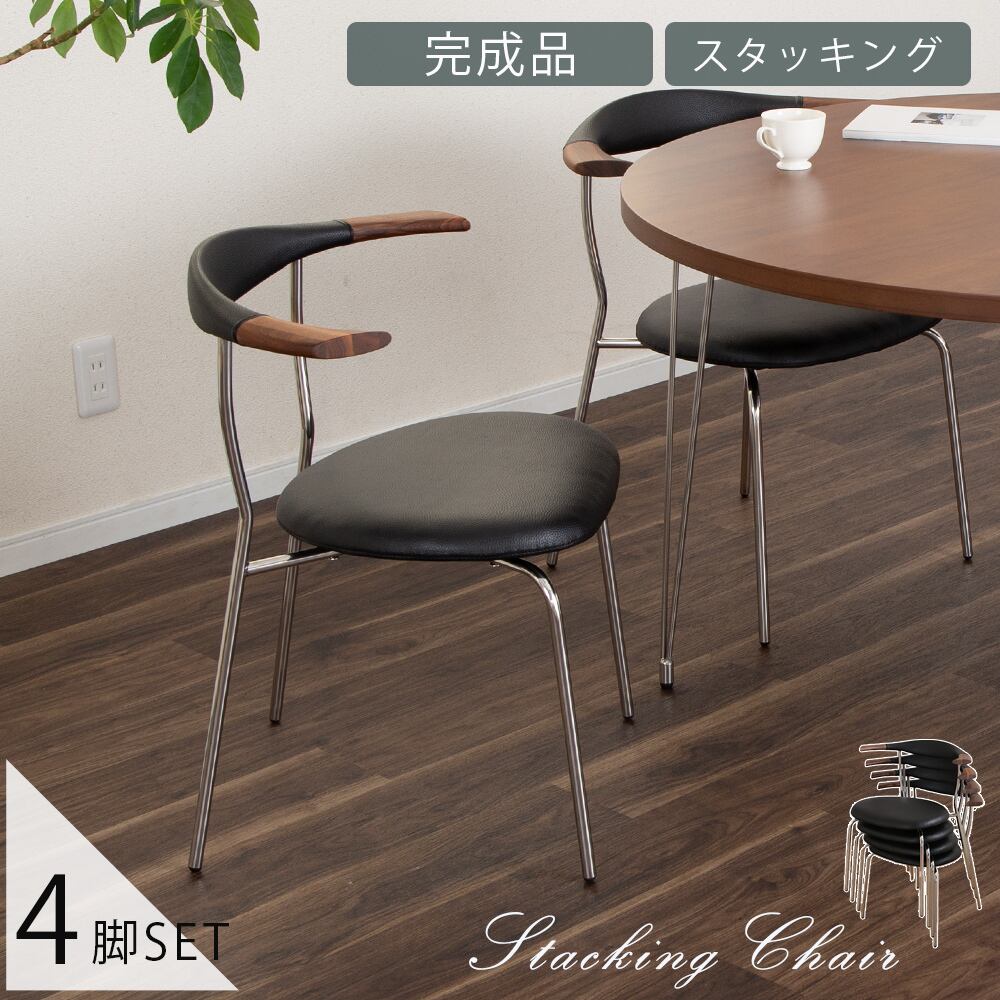 ダイニングチェア 4脚セット 完成品 スタッキングチェア 重ね 収納 おしゃれ 北欧 モダン ウォールナット ブラック ブラウン 無垢材 天然木 アイアン脚 座面 PVCレザー 合皮 背もたれ 4脚 4人 食卓チェア イス sn0463mbst