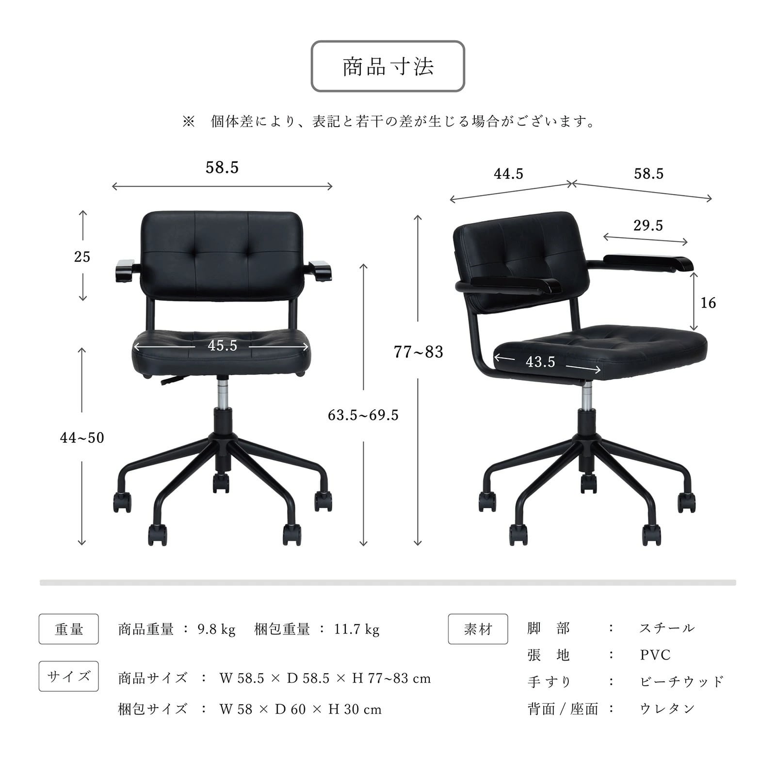 幅58.5×奥行58.5×高さ77-83cm(9.8kg)
