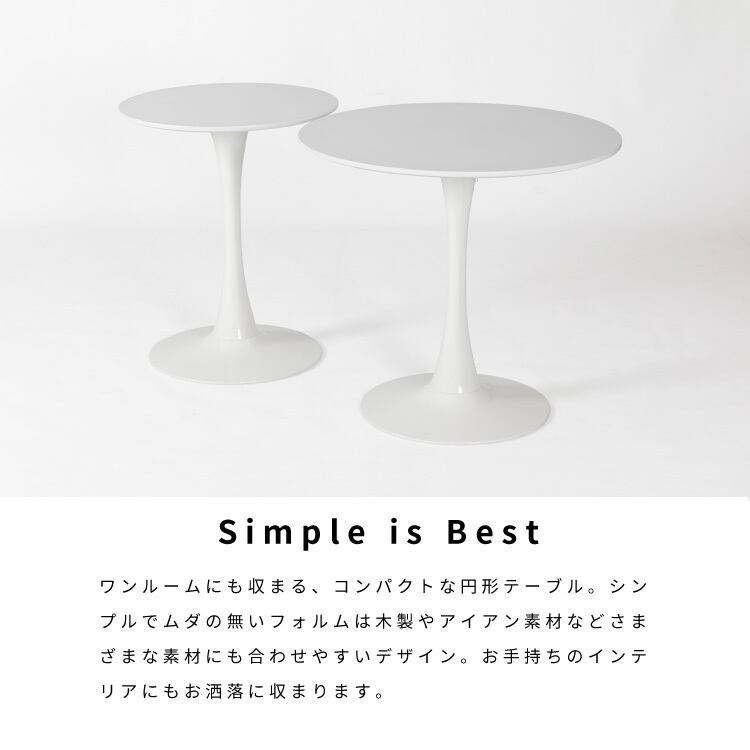 1本脚ですっきりとしたシンプルでムダのないフォルムは、ワンルーム収まるコンパクトサイズ。ワンルームや狭いお部屋にもダイニングのある生活を実現できます。