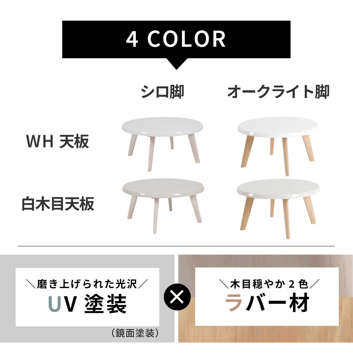 天板は「ホワイト」「白木目柄」の2種類、脚は「オークライト」「シロ」の2種類からお選びいただけます。