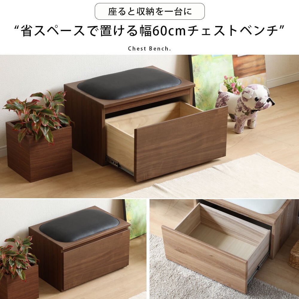 ベンチ 収納 木製 完成品 おしゃれ 玄関 ローチェスト スリム 北欧 ホワイト オーク ウォールナット 材 座れる おもちゃ箱 リビング ダイニング シンプル コンパクト 引き出し クッション 幅 60 高さ 39 奥行 41 1段 タンス 腰掛け 7001