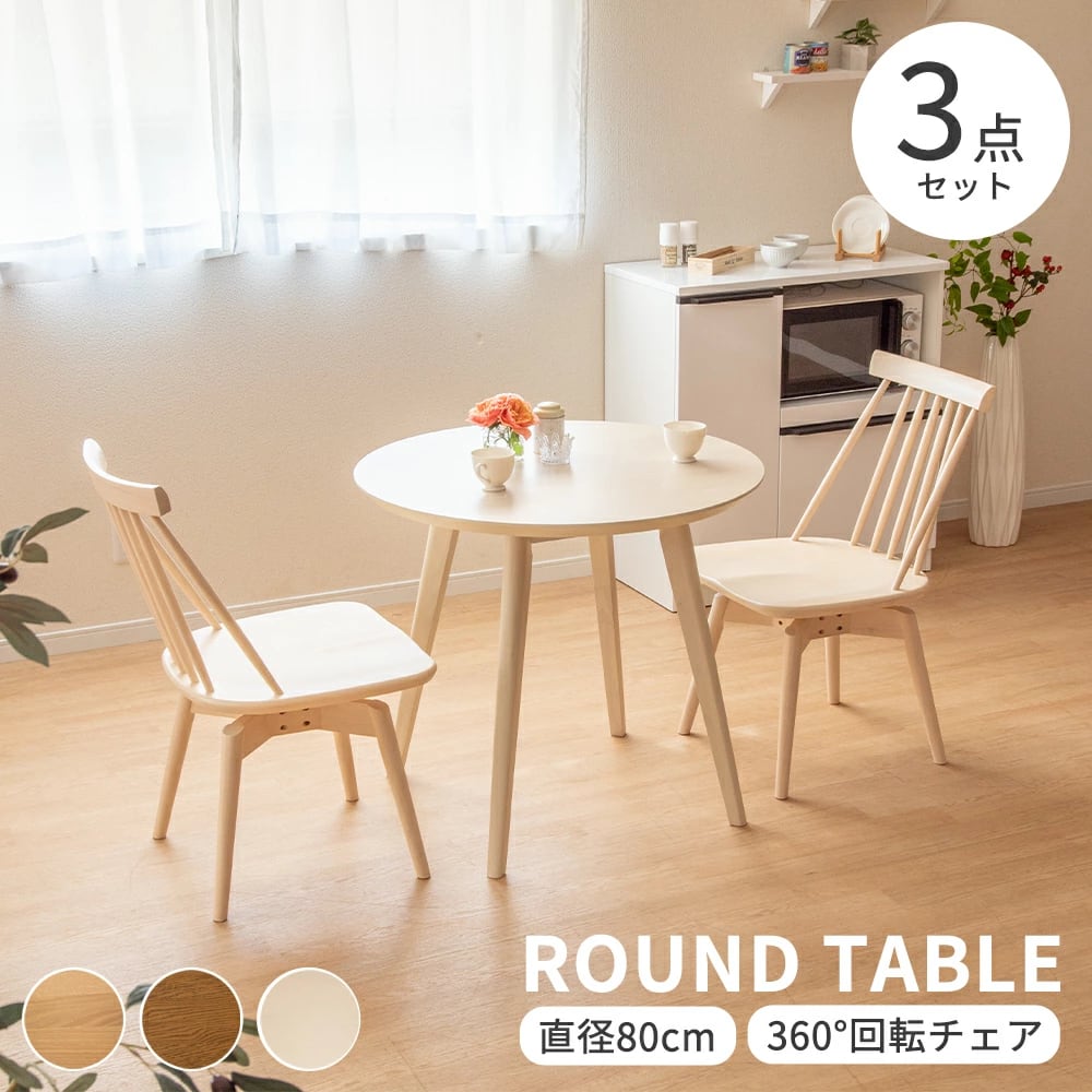 ダイニングセット テーブルセット 丸 ラウンド テーブル 3点 セット 2人掛け 丸テーブル 80cm 幅 小さめ 北欧 360度 回転チェア おしゃれ オーク 突板 ラバー ベージュ ブラウン ホワイト 木製 食卓 2人用 カフェテーブル 円形 コンパクト 二人掛け fds-2059-a