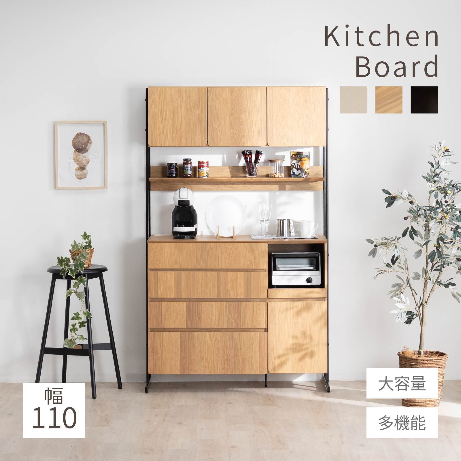 キッチンボード オープンボード 幅110 アイアン 脚 レンジボード オーク 突板 レンジ台 ハイタイプ コンセント付き スライドカウンター フルオープン 引出し 開き扉 可動棚 棚付き マグネット ブラック ベージュ ホワイト 北欧 モダン 8034