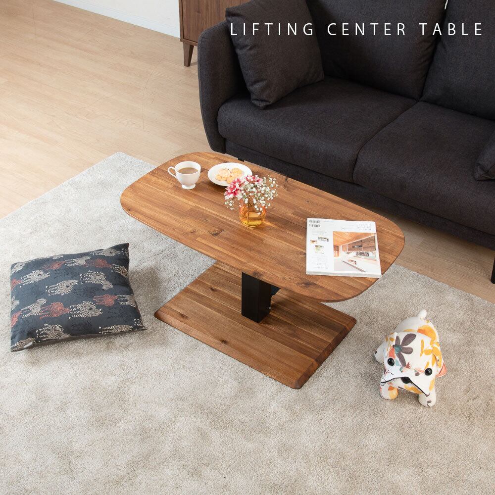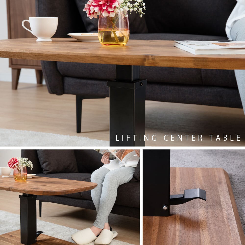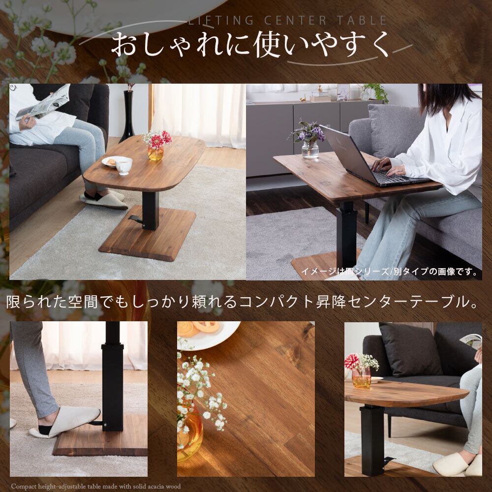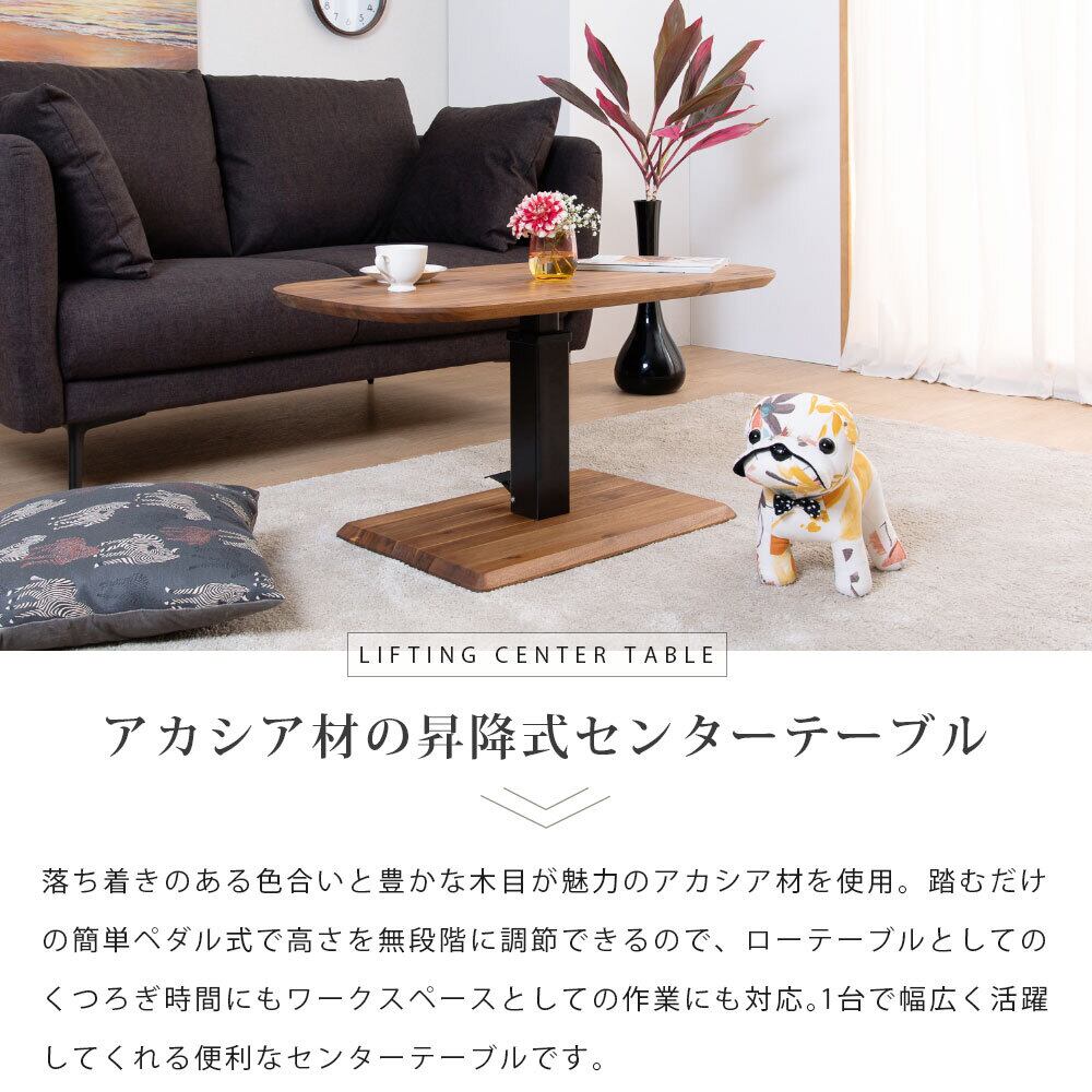 センターテーブル ローテーブル 昇降テーブル リビングテーブル 幅 90 昇降式 高さ 無段階 アカシア 天然木 スチール 脚 ブラウン おしゃれ モダン 90cm テーブル ロータイプ 低め 高さ44 高さ調節 リフティング ペダル式 楕円 丸 3018